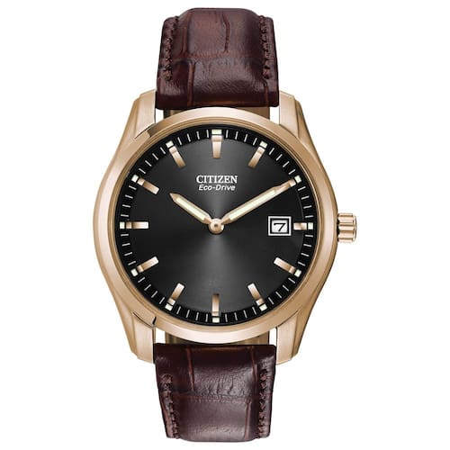 Relógio masculino clássico Citizen com pulseira de couro Eco-Drive, data, ponteiros e marcadores luminosos, mostrador preto, pulseira marrom/ouro rosa