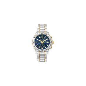- Relógio redondo em tom prateado com detalhes em tom de ouro amarelo com mostrador azul com janela de data, ponteiros/índices luminosos e submostradores de cronógrafo