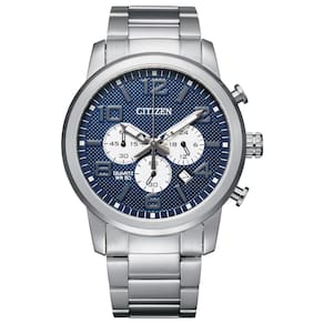 - Com uma pulseira e caixa de aço inoxidável, o quartzo da Citizen é coberto com uma face azul com todos os marcadores aplicados. Possui um cronógrafo, mede 12 e 24 horas e mostra a data.