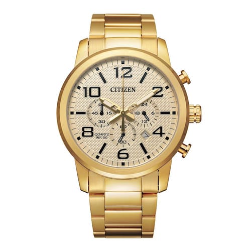 - O elegante quartzo da Citizen apresenta uma face champanhe com uma pulseira de aço inoxidável dourado e marcadores aplicados contrastantes. Possui formatos de tempo de 12 e 24 horas, tem funcionalidade de cronógrafo e mostra a data.