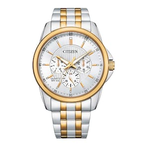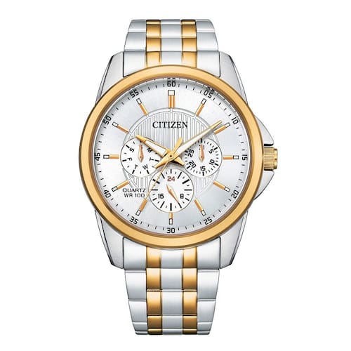 - O elegante quartzo da Citizen apresenta um mostrador prateado com uma pulseira de aço inoxidável dourado de dois tons e marcadores aplicados contrastantes. Possui 3 ponteiros com dia/data analógica, 12/24 horas com resistência à água de até 100 metros. A pulseira de aço inoxidável tem fecho dobrável com botões de pressão