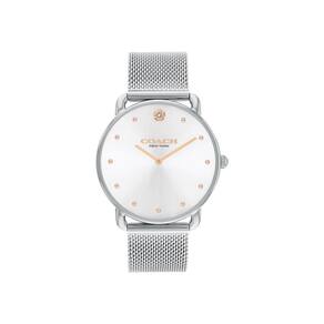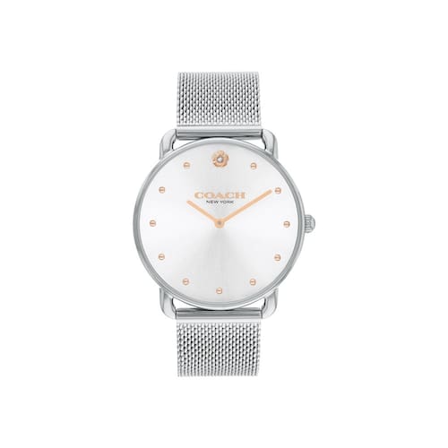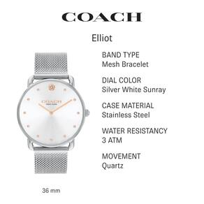Coach Relógio feminino Elliot com pulseira de malha | Elegância e sofisticação combinados | Relógio de qualidade premium para o dia a dia (modelo 14504207), Prata, Pulseira de malha - Com linhas simples e uma sensibilidade minimalista moderna, o Elliot é um verdadeiro design clássico pronto para dias úteis e fins de semana. - Materiais de qualidade: Finalizado com uma pulseira de malha elegante, este relógio redondo de aço inoxidável apresenta um mostrador branco com detalhes de tom de ouro rosa e o motivo Coach Tea Rose às 12 horas. - Precisão de quartzo: o movimento de quartzo oferece horário preciso e manutenção mínima para um relógio confiável e sem preocupações. - Cristal mineral durável: feito de vidro e protege o relógio de arranhões. - Cuidados com o seu relógio: o seu relógio Coach foi desenvolvido com atenção meticulosa à qualidade, função e detalhes. Recomenda-se um intervalo de manutenção de 3 a 5 anos, além de qualquer substituição de bateria necessária. Nunca abra o relógio. - Garantia de 2 anos: A Coach oferece uma garantia limitada de 2 anos contra defeitos de materiais e mão de obra que impedem que o relógio funcione adequadamente sob uso normal. Apenas as compras de um revendedor autorizado são cobertas pela garantia do fabricante.