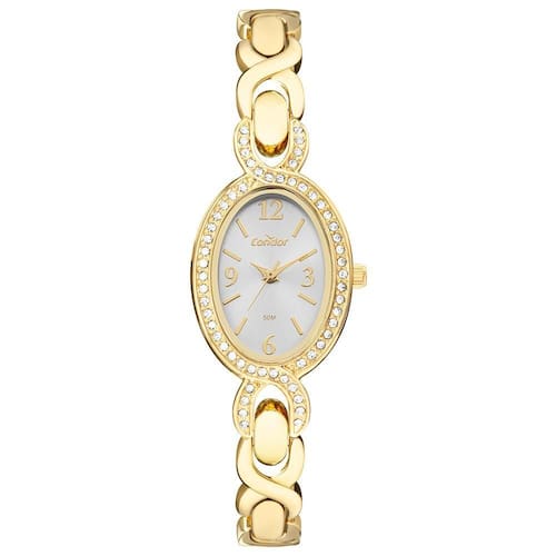Com caixa oval de 25 mm, o relógio apresenta aro cravejado de cristais cintilantes que destacam o mostrador prateado e conferem um toque de luxo. Os algarismos e ponteiros dourados complementam o estilo clássico e feminino, proporcionando leitura nítida e muito charme.