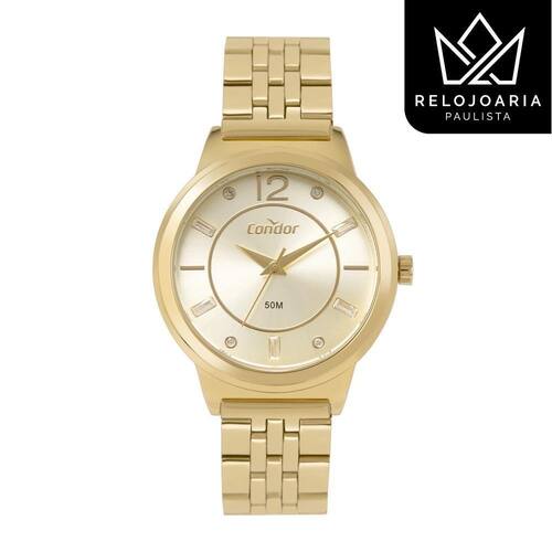 Relógio Condor Feminino Dourado COPC21JFR/K4D Relógio dourado, redondo com maquinismo analógico. Caixa e pulseira em aço com banho dourado. A Coleção Elegante, é para mulheres que gostam de um toque de brilho Com aplicação de cristais em formato de baguete, o modelo traz um detalhe especial para marcar os números no mostrador. Resistência de 5ATM. Acompanha ainda uma linda semijóia colar e brincos , ideal para presentear. Tamanho médio 3,6 cm .