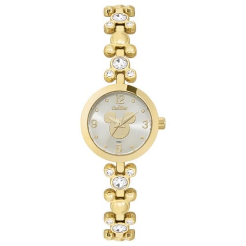 Relógio condor feminino ref: co2035ntf/5k dourado bracelete mickey Descrição do produto: Caixa de metal Pulseira de metal estilo bracelete com pedras Vidro de cristal mineral Fundo pressão Resistente à água 5 atm Diâmetro / largura da caixa: 25.00 mm Alimentação do maquinário: bateria Maquina japonesa Mostrador prateado com numeros, pedras e detalhes do personagem mickey mouse Produto oficial licenciado disney de 1 ano
