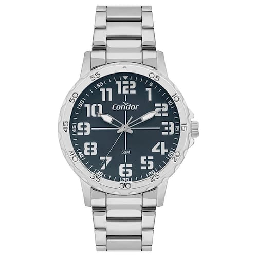 O relógio Condor CO2035NRU/4A traz um visual impactante com seu mostrador azul escuro contrastando com os marcadores brancos, oferecendo excelente visibilidade e um toque moderno. A caixa robusta de 47 mm e a pulseira em aço inox conferem presença e resistência ao acessório.