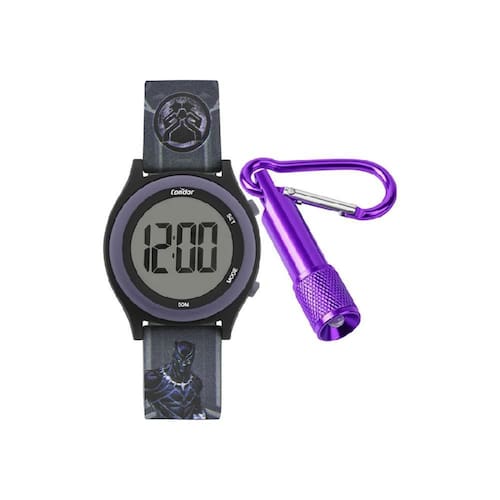 Relógio Condor Masculino Ref: Cobj3572an/k8p Infantil Pantera Negra DESCRIÇÃO DO PRODUTO: Caixa de Resina Preta com detalhes em Roxo Pulseira de Silicone Cinza Estampada com personagem Pantera Negra Fundo de Parafusado Diâmetro / Largura da Caixa: 36.00 MM Funções: Digital, Calendário Resistente à água 5 ATM Alimentação do Maquinário: Bateria Maquina Japonesa Mostrador Preto com detalhes em branco Linha: Condor Kids + Lanterna Produto Oficial Licenciado Marvel Classificação Indicativa: A partir de 4 Anos de Idade de 1 Ano Marca: Não Informado
