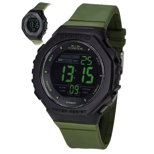 Funções: Digital, Calendário, Cronógrafo, Alarme, Iluminação, Timer, Dual Time