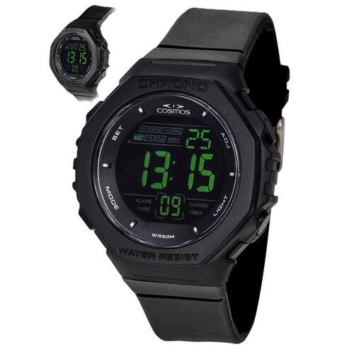 Funções: Digital, Calendário, Cronógrafo, Alarme, Iluminação, Timer, Dual Time