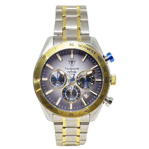Relógio Cronógrafo Masculino de Aço Tuguir ógico 23-2231 Prata e Dourado Relógio Cronógrafo Masculino de Aço Tuguir ógico 23-2231 Prata e Dourado Marca: Tuguir Categoria: ógico ógico: Sim 1 Horário Ponteiros Fluorescentes: Sim Digital: Não Cronômetro: Sim Luz: Selecione Resistente à Água: 5 ATM Pode ser para nadar no raso, por pouco tempo submerso - Respingos: Sim - Chuva: Sim - Lavar Carro: Sim - Lavar Louça: Sim - Natação: Sim - Mergulho: Não Característica do Vidro: Cristal Mineral Tipo de Fecho: Dobrável com Botão Cor da Caixa: Prata Material da Caixa: Aço Formato da Caixa: Redondo Diâmetro da Caixa: 41,00 mm Espessura da Caixa: 11,00 mm Cor da Pulseira: Prata Material da Pulseira: Aço Largura da Pulseira: 17,50 mm Comprimento Máximo da Pulseira: 270,00 mm Alimentação: Bateria Interna Peso Líquido: 0,120 Kg Modelo: 23-2231 Cor Predominante: Prata Cor Diferencial: Dourado : 12 Meses Conteúdo da Embalagem: 01 Relógio 01 Embalagem 01 Termo de Marca: Não Informado