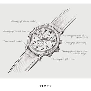 PRODUTO INTERNACIONAL. "O Timex Expedition Field Chrono inspira-se no design de relógios militares antigos. O mostrador exclusivo possui numerais em incrementos de cinco até 60 e três sub-mostradores que rastreiam minutos, segundos e 1/20 de segundo por até 30 minutos. Uma janela de data fácil de operar está localizada às 4 horas. Com a função Data Rápida, você pode definir a data no relógio sem girar a coroa para cada período de 24 horas. Basta puxar a haste no meio do caminho, e girar até que a data desejada seja alcançada. Também oferece resistência à água a 100 metros e uma correia de couro durável. A luz noturna Indiglo ilumina uniformemente a superfície do mostrador do relógio usando tecnologia de iluminação eletroluminescente azul patenteada. Ele usa menos energia da bateria do que a maioria dos outros sistemas de iluminação do relógio, permitindo que a bateria do relógio dure mais tempo." Da trilha até o topo da montanha, você está livre para explorar com este relógio de campo robusto o suficiente para lidar com qualquer coisa que a vida jogue em seu caminho.