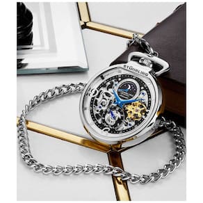 O horário duplo e o movimento automático o manterão atualizado, não importa o quão agitada seja sua agenda. Um relógio tão único quanto você. Este relógio de bolso e corrente se destacarão em um mar de relógios chatos. Um fundo de caixa de exibição e um suporte de relógio adicionarão elegância à sua mesa ou a qualquer lugar onde você trabalhe. Tamanho da Caixa 48mm