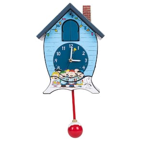 Mark Feldstein & Associates Peanuts Gang Snoopy Linus Lucy ICY Blue 43 x 23 Relógio de Natal Cuckoo - O mostrador cuco colorido e ricamente detalhado apresenta a amada turma de amendoins celebrando a temporada de férias como só eles podem. Para adicionar um pouco de ambiente à ocasião festiva, cada hora é anunciada pelo Snoopy entrando pelas portas do sótão, acompanhado pela memorável música "Linus & Lucy" - Feito de acrílico com acabamento azul gelado; requer 2 pilhas C e 1 AA (não incluídas); à noite, um sensor de luz desativa a música, permitindo que Snoopy (e você) durma um pouco - Mede aproximadamente 43 x 22 x 12 cm; o relógio peculiar possui um pêndulo oscilante que pode ser removido para exibição de cornija ou mesa - Peanuts deixou uma marca indelével na cultura popular com ícones duradouros - Enviado em embalagem protetora