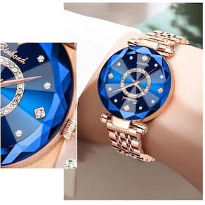 Relógio De Dama Binbond Ouro Rosé Cristal Azul Profundo Fino Relógio Feminino Binbond Quartz Cristal Multifacetado e Ouro Rosé