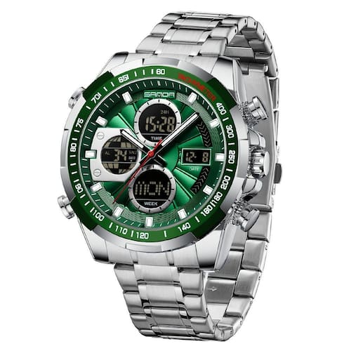 Este relógio esportivo masculino combina estilo e funcionalidade em um design sofisticado e resistente. Com uma caixa em liga de zinco e pulseira em aço inoxidável, oferece durabilidade e elegância para o uso diário em ambientes esportivos ou empresariais. O mostrador duplo aprimora seu apelo visual e permite fácil leitura do horário, enquanto a resistência à água de 5 ATM garante desempenho confiável em diversas condições.