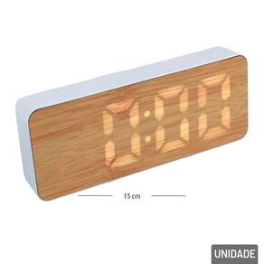 Relógio de Mesa Digital 15cm LED Despertador Adicione um toque de sofisticação e modernidade ao seu ambiente com o Relógio de Mesa Digital com Despertador, com o formato retangular de 15cm, que combina tecnologia e elegância em um design minimalista de madeira. Com visor em LED, ele exibe as horas com alta visibilidade e conta com funções adicionais para tornar o seu dia a dia mais prático. Ideal para quartos, escritórios, salas de estar ou qualquer espaço que precisa de um toque de estilo e funcionalidade.\nExibição clara e brilhante das horas, mesmo em ambientes com pouca iluminação. Conta com alarme programável para ajudar a manter a rotina organizada. Além das horas, pode mostrar a temperatura ambiente, tornando-se ainda mais útil no dia a dia. Pode ser utilizado com cabo USB ou pilhas, oferecendo flexibilidade para diferentes necessidades. Interface intuitiva e prática para ajustes rápidos de hora, alarme e brilho.\nUtiliza: 3x Pilhas AAA (Não Inclusas).\nAcompanha cabo USB. Informação Adicional Marca : TINGS Tipo de material : Componentes Eletrônicos, Plástico Cores ou Estampa : Branco Dimensões do Produto : 6 X 5 X 4 CM Dimensões da Embalagem : 6,5 X 15,5 X 4,5 CM Peso Bruto (Gramas) : 0.123 Marca: Não Informado