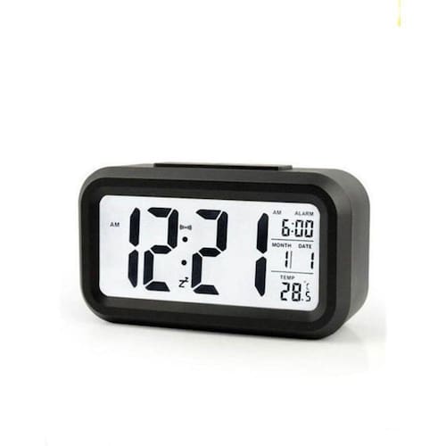 Relógio de Mesa Digital Portátil Preto Relógio portátil de mesa digital. Funções: despertador, hora, temperatura, data, iluminação noturna. Possui um sensor que detecta escuridão e liga automaticamente a luz para poder enxergar os números no escuro. Cor: preto. Medidas: comprimento 13cm x altura 7cm x profundidade 4,6cm. Funciona com 3 pilhas AAA. Marca: Foxhome