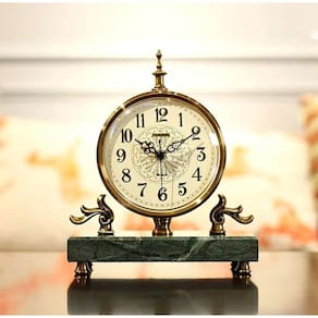 Características principais: Design: O relógio possui um formato redondo clássico, com uma base robusta de mármore que confere estabilidade e um toque de luxo.