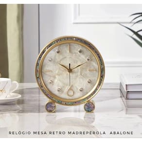 Relógio de Mesa Redondo Retro Detalhes Madrepérola Abalone e Metálico 16x7x8.5cm