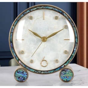 Relógio de Mesa Redondo Retro Detalhes Madrepérola Abalone e Metálico 16x7x8.5cm