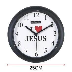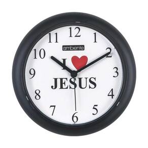 Relógio de Parede Ambiente Eu Amo Jesus 191800-034 Preto Este Relógio, deixara seu ambiente ainda mais despojado e harmonizado com toda a sua decoração. Além de ser uma peça indispensável para seu espaço e o seu dia a dia. Características:ean: 7897280349065Marca: AmbienteModelo: 191800-034Cor: PretoCor do mostrador: BrancoFormato: RedondoTamanho: 25cmQuartzComposição: Polímeros diversos e metais recicláveisUsa pilha AA Não incluso Dimensões da Embalagem:Altura: 6cmLargura: 26cmProfundidade: 26cmPeso: 0,450KgGarantia: 12 Meses