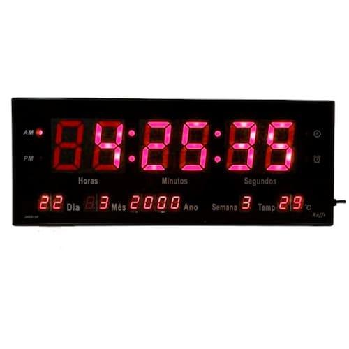 Relógio De Parede Calendário Temperatura MEspecificações técnicas:Alarme- Relógio, Modo 12 ou 24h com calendário e sensor temperatura incluso- Gabinete em plastico resistente muito leve e design compacto na cor preta;- Displays com alta performance para visualização em ambientes internos;- Cores do Display: Vermelho.- Botões laterais para controle e acesso do equipamento;- Visualização: até 30m.- Uso interno.- bivolt: 110 ou 220V automáticoFácil visualização à distânciaCaracterísticas:- Excelente Nitidez- Temperatura- Hora- Dia, Mês e Ano.- Alarme até 4 programações- Calendário- Dia da semana em português- Números grandes de fácil visualização 5 x 3 cm.- Fácil ajuste.- Fácil Instalação.- Sistema eletrônico de Quartz, não atrasa nem adianta.- Não perde a memória quanto acaba a energia.Dimensões:Largura: 36 cmAltura: 15 cmProfundidade: 3 cmCor: Preto com Led VermelhoItens incluídos:1 - Relógio 36 x 15 x 3 cm Preto com Led Vermelho - 3615p1 - Cabo 1.10 Cm1 - Fonte Bivolt Marca: Yiwu Jingheng Electrnc Co.Ltd.