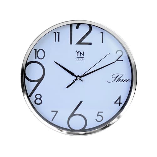 Relógio de parede com números grandes para facilitar a visualização, bordas prateadas, ponteiro de segundos contínuo.