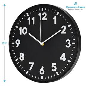 Relógio de Parede Cozinha 30cm Silencioso Urban Fosco Cor: Preto Perfeito para quem busca uma opção única e estilosa para a casa, este relógio é feito de material resistente, com acabamento reforçado, números grandes e design moderno. Seu mecanismo é ultra silencioso sem tic-tac e de baixo consumo, funcionando com apenas 1 pilha AA pilha comum .