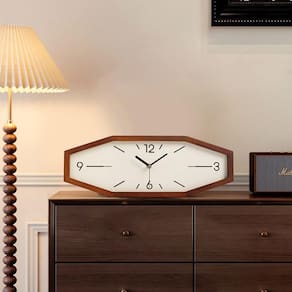 Fabricado em madeira maciça resistente com acabamento castanho quente, este relógio oferece durabilidade prolongada e estética clássica que complementa diversos estilos de decoração. O movimento de quartzo silencioso e sem tic-tac assegura um ambiente tranquilo, perfeito para quartos ou locais de trabalho onde o silêncio é valorizado.