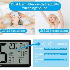 Relógio De Parede Digital Grande Wallarge De 14,5 \\'\\' Operado Por Bateria Com Números Enormes - Preto - 14 Polegadas Grande relógio de parede digital com números grandes fácil de ler. O relógio de parede digital WallarGe tem uma tela LCD de alta definição que mede 14 x 6 polegadas e a exibição da hora é de 8,1 x 4,3 polegadas. A tela grande ajuda você a ler a hora de vários ângulos à distância da sala. Você também pode ler a temperatura interna e a data na tela para obter informações completas. Relógio de parede digital operado por bateria - fácil de configurar. O relógio é suportado por bateria 4xAA (não incluída). Há um indicador de bateria fraca na tela quando a bateria não tem energia suficiente, não há mais preocupações em esquecer de substituir baterias novas. Os botões de função estão na parte traseira e são fáceis de configurar. Exibição de dia e temperatura comutável - Existem três modos opcionais para exibição de dia/temperatura: somente dia, somente temperatura, exibição de dia e temperatura em turnos a cada 10s. Basta clicar no botão atrás para escolher o modo de exibição de sua preferência. Não importa qual modo de dia/temperatura você escolher, a hora e a data não serão alteradas. Relógio digital grande para montagem em parede com suporte dobrável - Relógio digital para parede ou mesa. O relógio vem com uma régua de modelo de montagem mostrando 8,7 polegadas de distância entre dois furos de montagem, então você não precisa medir furos na parede. Se pretende que seja colocado sobre uma secretária sem furos na parede, basta desdobrar o suporte desdobrável. Relógio de parede com display grande com AUTO DST - O relógio ajustará automaticamente a hora no horário de verão com AUTO DST ativado. Possui dois modos de exibição de hora (horário militar e horário padrão), basta clicar no botão 24/12 para alternar. E o alarme é opcional, pode ser desligado manualmente se não houver necessidade.
