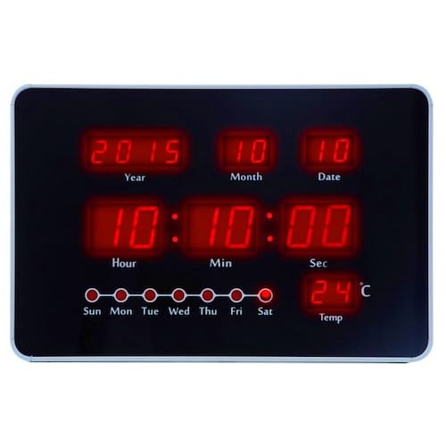 Relógio de Parede Digital - 6455 Estilo: Moderno Medidas: 37,5L x 24,5A x 2,5E cm Características Técnicas: Calendário em Inglês Display com minuto e segundo Lâmpada led Termômetro Voltagem 127/220 volts bivolt Cores Disponíveis: Preto com Prata Metálico Mais Informações sobre o produto Relógio de parede Digital Grande Base Plástico Injetado-Pintado Acompanha fonte de alimentação 127/220 volts automática Qualidade Herweg Certificada ISO9001 Marca: Não Informado Ean: 7897280340284
