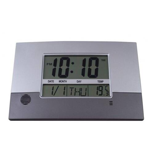 Relógio de Parede Digital HERWEG 6473-034 Estilo: Moderno, Código 03676-0318-73 Medidas: 19A X 28,8L X 2,6E cm Alarme com melodia musical Calendário em Inglês Relógio para parede e mesa Usa pilha AA Termômetro com duas escalas Formato das Horas AM PM Cores Disponíveis:Preto com Prata Metálico Base: plástico pintado Garantia de 1 ano