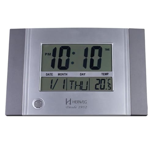 Relógio de Parede Digital HERWEG 6472-071 Estilo: Moderno, Código 03529-0318-73 Medidas: 19A X 28,8L X 2,6E cm Alarme com melodia musical Calendário em Inglês Relógio para parede e mesa Usa pilha AA Termômetro com duas escalas Formato das Horas AM PM Cores Disponíveis:071 Cinza com Prata Metálico Base: plástico pintado Garantia de 1 ano Ean: 7897280346507