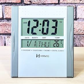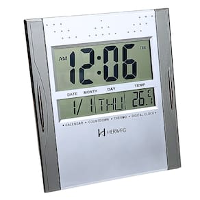 Marca: HERWEG Modelo: 6474 - 071 Tipo de relógio: Relógio de Parede e Mesa Formato: Retangular Calendário: Sim Alarme: Sim Contagem Regressiva: Sim Termômetro: Sim Cor da caixa: Cinza Metálico Cor do fundo: Display Digital Luz: Não Material da Caixa: Polímeros diversos Características do vidro: Acrílico Tamanho da caixa: 22 x 25 (Larg x Alt) Espessura da caixa: 3 cm Peso: 462 Gramas Alimentação: 2 pilhas AA 1,5 Volt – não inclusas Garantia do Fabricante: 12 meses Prazo de validade: Indeterminado Fabricante: HERWEG – Indústria Brasileira