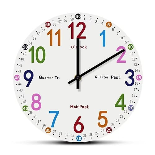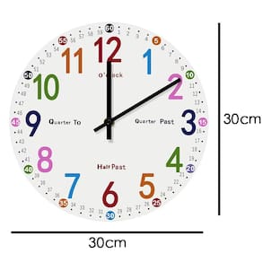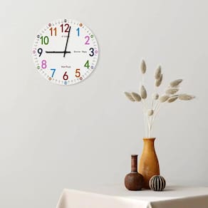 Material: Material da concha: Nenhum Material do espelho: Nenhum Material do mostrador: acrílico Tamanho: 12 polegadas Peso: 380 g Design divertido e vibrante com números coloridos e marcadores de tempo, perfeito para ajudar as crianças a aprenderem a contar as horas. Relógio de 12 polegadas com números em negrito e fáceis de ler, ideal para salas de aula ou salas de aula infantis. O movimento silencioso e não aderente de quartzo garante um ambiente silencioso para estudar, tirar uma soneca ou brincar. Feito com acrílico durável para o mostrador, garantindo uso duradouro e fácil leitura do tempo. Uma ferramenta educacional perfeita para jovens alunos, ajudando as crianças a praticarem o tempo de leitura de uma forma envolvente.
