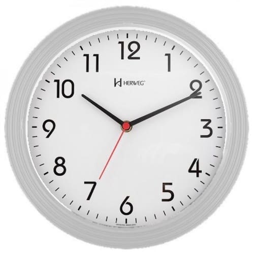 Relógio de Parede Herweg 6633-132 Tamanho: 28cm de diâmetro X 3cm de espessura Máquinário: Step Tic Tac Cor do fundo: Branco Cor da Estrutura: Branco Base: Plástico pintado Vidro: Acrílico Usa pilha AA 1 Ano de do Fabricante
