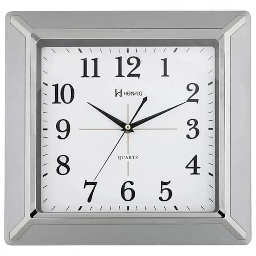 Relógio De Parede Herweg Quadrado 6269 - Prata Metálico único Relógio de Parede Herweg Quadrado 6269 - Prata Metálico único - Características Gerais do Produto: - Alimentação: Pilha AA ( não inclusa) - Funcionalidade: Mecanismo Sweep (Ponteiro de segundos contínuo) - Material: Plástico pintado; Cristal mineral - Medidas: A: 35 x L: 35 x P: 4cm - Observações: Inclui suporte para pendurar; Botões de regulagem na parte traseira - Modelo referência do produto: 6269-70 Acompanha o produto: - 01 Relógio - Eletrônica - Garantia de 12 meses do Fabricante - Embalagem - Manual de Instruções Garantia: - 12 Meses de Garantia de