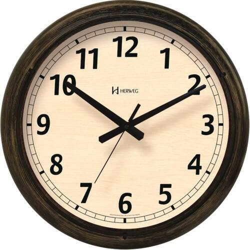 Relógio De Parede Herweg Ref: 660127-245 Ouro Envelhecido DESCRIÇÃO DO PRODUTO: Medidas: 40D x 5E cm Características Técnicas: Usa pilha AA Mecanismo Step Tic-Tac Produto Nacional Informações sobre o produto: Relógio de parede Base em Plástico Injetado/Pintado Botões de regulagem na parte traseira do produto Cor da Base: Ouro Envelhecido Cor do Mostrador: Bege estilo madeira Perfeito para Decoração de ambientes de 1 ano Marca: Não Informado
