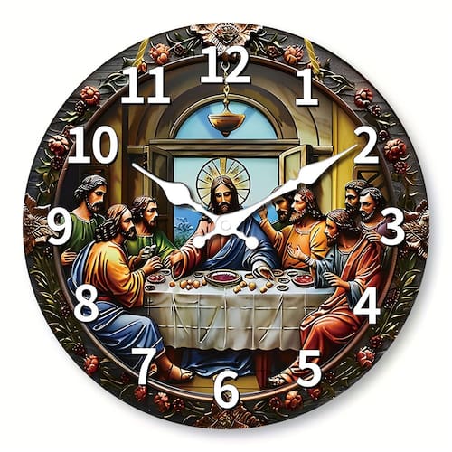 Material: Material da concha: madeira Material do espelho: Nenhum Material do mostrador: MDF Tamanho: 12 polegadas Peso: 560G Design de arte religiosa: com a icônica cena da “Última Ceia”, este relógio dá um toque espiritual e artístico a qualquer espaço, perfeito para salas religiosas ou temáticas de igrejas. Mecanismo silencioso sem tique-taque: equipado com um movimento de quartzo de alta qualidade, garantindo um ambiente tranquilo e pacífico em sua casa ou igreja. Construção durável em MDF: feita com material de MDF resistente para durabilidade duradoura e um acabamento limpo e suave. Números fáceis de ler: números brancos em negrito para facilitar a verificação do tempo, mesmo à distância, em um fundo rico e detalhado. Versátil e inspirador: ideal para salas de estar, salas de jantar, igrejas ou espaços religiosos, combinando função com arte espiritual.