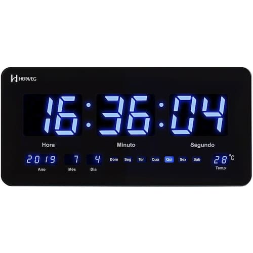 Relógio De Parede Herweg 6492-034 Tamanho: 21,5cm de largura X 45,8cm de altura X 2,4cm de espessura Maquinário: Digital Cor: Preto com digital azul Calendário Visualização em 12h ou 24h Display com minuto e segundo Cabo de alimentação certificado pelo INMETRO Lâmpada LED Azul Termômetro Bivolt 110/220v Ligado em energia elétrica Base: Plástico/Vidro pintado Fabricado por HERWEG RELÓGIOS com Garantia de 1 Ano Ean: 7897280552496