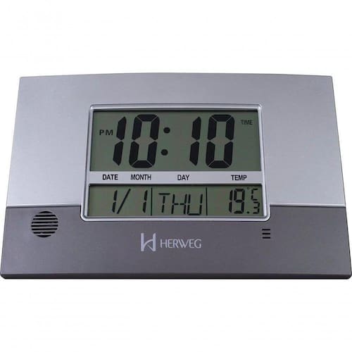 Relógio De Parede Ou Mesa Digital Lcd Calendário Termômetro Prata Herweg 6473 único Relógio de Parede ou Mesa Digital LCD Calendário Termômetro Prata Herweg 6473 único - Características Gerais do Produto: - Alimentação: Pilha AA ( não inclusa) - Funcionalidade: Visualização em 12h ou 24h; Termômetro; Termômetro com duas escalas; Calendário em Inglês; Relógio AM/PM; Timer; Alarme com melodia musical; Formato das Horas AM / PM; Visor LCD - Material: Plástico injetado pintado - Medidas: A: 19,0 x L: 28,8 x P: 2,6cm - Observações: Inclui suporte para pendurar ou pés para apoiar na mesa; Botões de regulagem na parte traseira - Modelo referência do produto: 6473-71 Garantia: - 12 Meses de Garantia de Fábrica