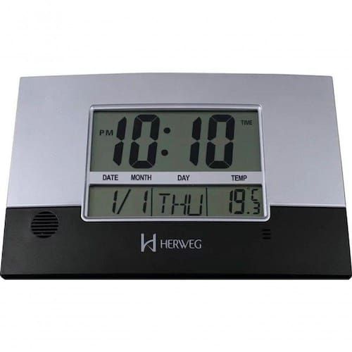 Relógio De Parede Ou Mesa Digital Lcd Calendário Termômetro Preto Herweg 6473 único Relógio de Parede ou Mesa Digital LCD Calendário Termômetro Preto Herweg 6473 único - Características Gerais do Produto: - Alimentação: Pilha AA ( não inclusa) - Funcionalidade: Visualização em 12h ou 24h; Termômetro; Termômetro com duas escalas; Calendário em Inglês; Relógio AM/PM; Timer; Alarme com melodia musical; Formato das Horas AM / PM; Visor LCD - Material: Plástico injetado pintado - Medidas: A: 19,0 x L: 28,8 x P: 2,6cm - Observações: Inclui suporte para pendurar ou pés para apoiar na mesa; Botões de regulagem na parte traseira - Modelo referência do produto: 6473-34 Garantia: - 12 Meses de Garantia de Fábrica