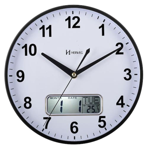 Acabamento / funcionalidades: Preto; Branco Alimentação: Pilha AA não inclusa Funcionalidade: Mecanismo Sweep Ponteiro de segundos contínuo ; Termômetro; Calendário em Inglês Material: Visor de Vidro; Plástico injetado Medidas: A: 26 x L: 26 x P: 5cm Observações: Inclui suporte para pendurar; Botões de regulagem na parte traseira Modelo referência do produto: 4608-034