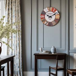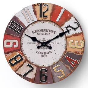 Este relógio de parede vintage de 30 cm traz um toque nostálgico de charme rústico para a decoração da sua casa. Inspirado no icônico design da Estação Kensington de Londres de 1887, apresenta um mostrador lindamente envelhecido com segmentos multicoloridos em tons quentes de vermelho, marrom, creme e verde. Os grandes números arábicos são exibidos claramente em cores contrastantes, facilitando a leitura à distância e adicionando um toque artístico vibrante.