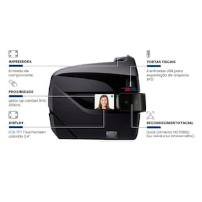 Equipamento Eletrônico para controle de frequência de funcionários. Possui leitor facial para que o colaborador possa bater o ponto através de sua face. Possui integração com vários softwares de gerenciamento e tratamento de ponto. Utiliza bobina para que seja impresso o comprovante do colaborador. Está totalmente de acordo com as leis vigentes. Possui comunicação via TCP-IP e também por USB. Possui fonte bivolt (110V e 220V).