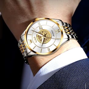 Relógio de pulso de design clássico especialmente criado para homens, O relógio vem com vidro 100% resistente durável e um mostrador fácil de ler as horas, movimento automático oferece um visual elegante de alta qualidade e durável e precisa. Relógio versátil combina com todas as ocasiões, sejam elas formais ou casuais. Use este relógio desde trabalho, lazer até atividades internas e externas ou para uso diário. são um presente perfeito para você e seus entes queridos.