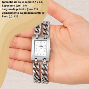 Ficha Técnica: Marca: Champion Modelo: CF24742Q Movimento: Analógico Material da Caixa: Metal Material da Pulseira: Metal Resistência à água: 3 ATM Formato: Quadrado Gênero: Feminino Estilo: Social Tamanho da caixa (cm): 2,7 x 3,5 Espessura (cm): 0,8 Largura da pulseira (cm): 2,5 Comprimento da pulseira (cm): 19 Peso (g): 123