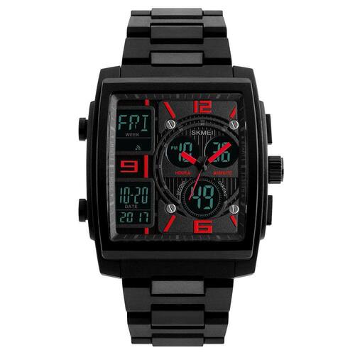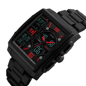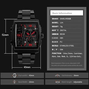 Este relógio é um relógio masculino. Moderno e casual, estilo esportivo. É adequado para homens e meninos. Tem muitas funções: contagem regressiva, calendário completo, cronógrafo, display semanal, alarme, formato de caixa retangular de 12/24 horas. O material da pulseira é PU. Muito confortável de usar. Leve. À prova d'água de 50 metros. É um bom relógio esportivo.