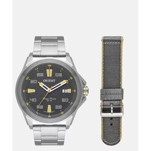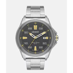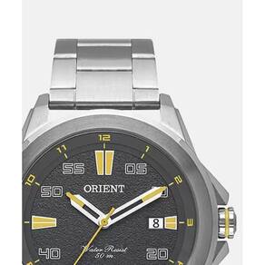 Relógio masculino com sistema analógico com ponteiros indicando as horas, minutos e segundos. Caixa em aço com vidro em cristal mineral e pino para ajuste de horas. Mostrador personalizado com calendário diário, indicadores tracejados e numerosos. Pulseira em aço trabalhado com fechamento dobrável.