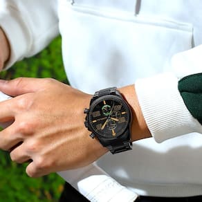 Relógio de pulso masculino com mecanismo a quartzo e design esportivo. Possui um dial grande para leitura fácil e é impermeável até 3ATM, tornando-o resistente à água para uso diário e atividades leves. Ideal para quem busca estilo e praticidade.